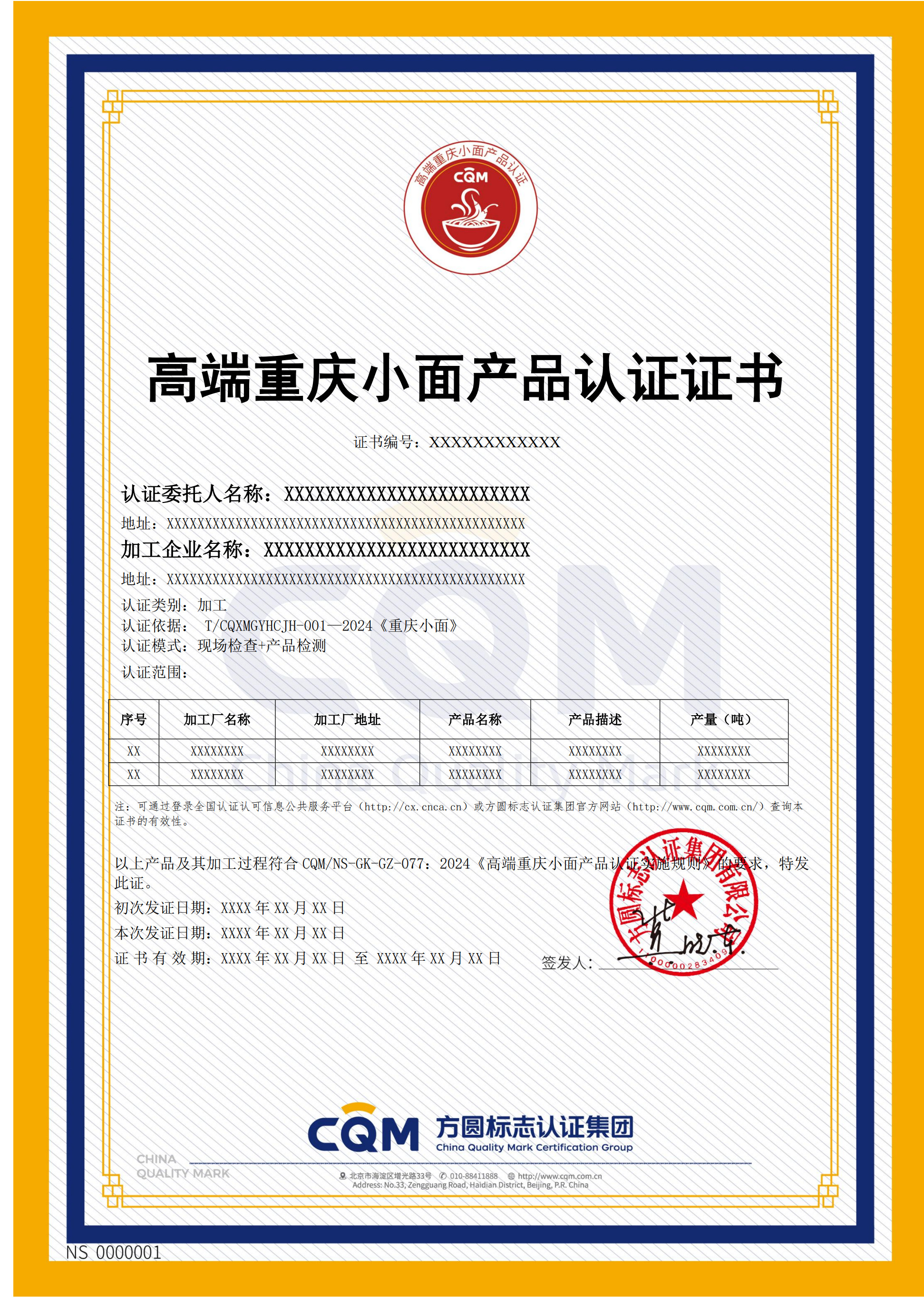 高端重慶小面是以優質面粉手工制面為基底,搭配時令鮮蔬、特色臊子等精心調制,經傳統技藝匠心烹制而成的具有麻辣鮮香、筋道醇厚特色風味的經典面食。高端重慶小面產品認證是由CQM 方圓第三方專業認證機構依照國家認證認可監督管理委員會認證管理要求,按照高端重慶小面產品實施規則和技術規范,對重慶小面的原料品質、制作工藝、風味特色及安全標準等進行的權威合格評定活動。該認證通過對高端重慶小面的食材甄選、制作流程、風味呈現及品質管控等方面進行嚴格評審與確認,為消費者提供可信賴的高端重慶小面產品標識,助力行業品質升級。