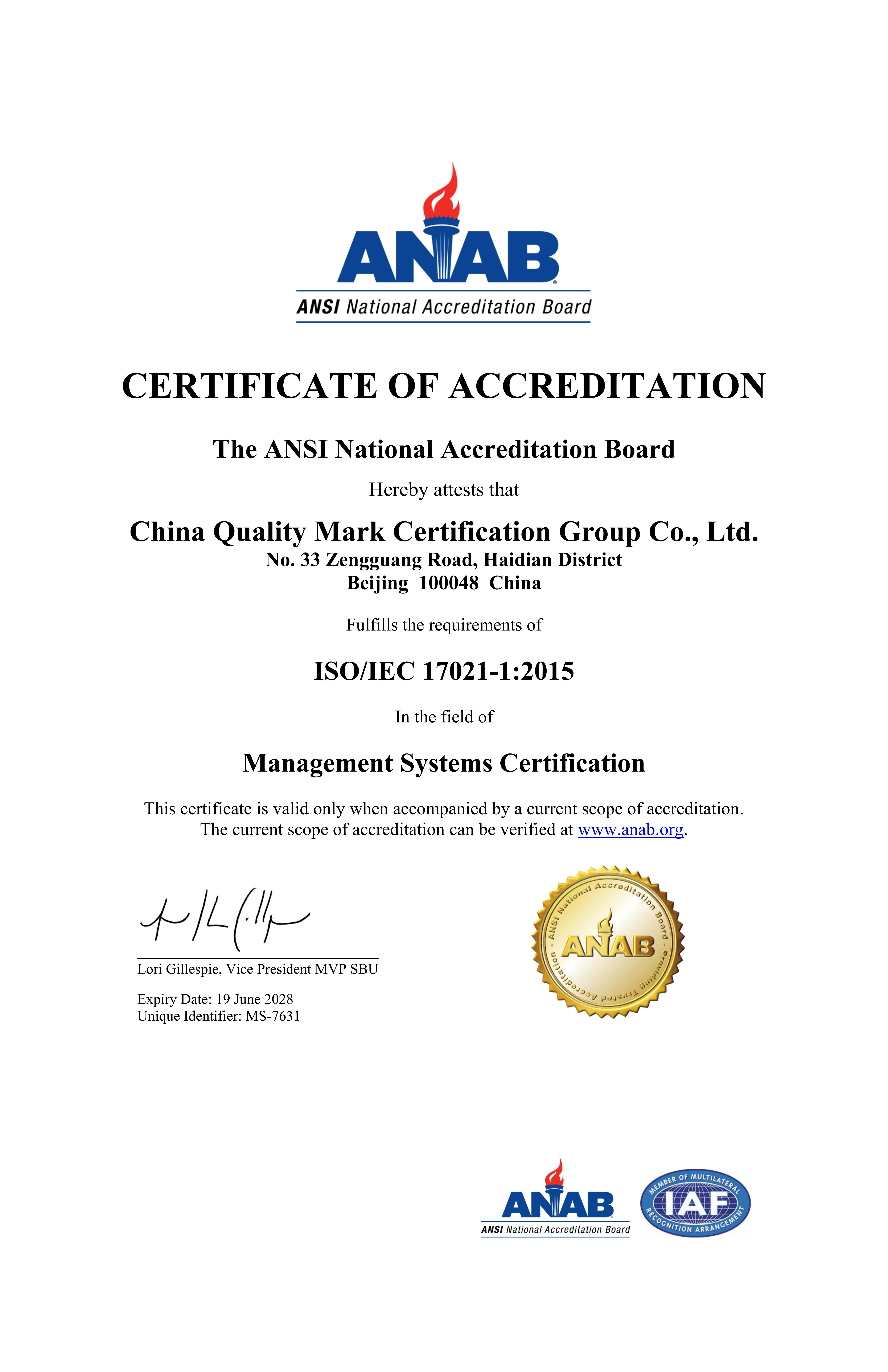 質量管理體系認證機構認可證書