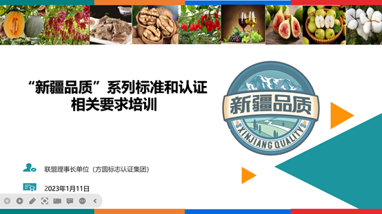 培訓中,自治區市場監督管理局認證認可監管處副處長靳軍介紹了認證監管的相關要求。方圓集團就聯盟發布的相關文件作了詳細介紹,并對標準主要內容以及“新疆品質”認證流程進行解讀。聯盟成員單位代表及聯盟各認證機構管理人員和技術人員等通過遠程學習的方式參加此次培訓。