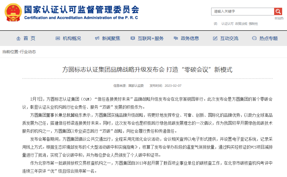 國家認(rèn)監(jiān)委官網(wǎng)刊發(fā)《方圓標(biāo)志認(rèn)證集團(tuán)品牌戰(zhàn)略升級(jí)發(fā)布會(huì) 打造“零碳會(huì)議”新模式》