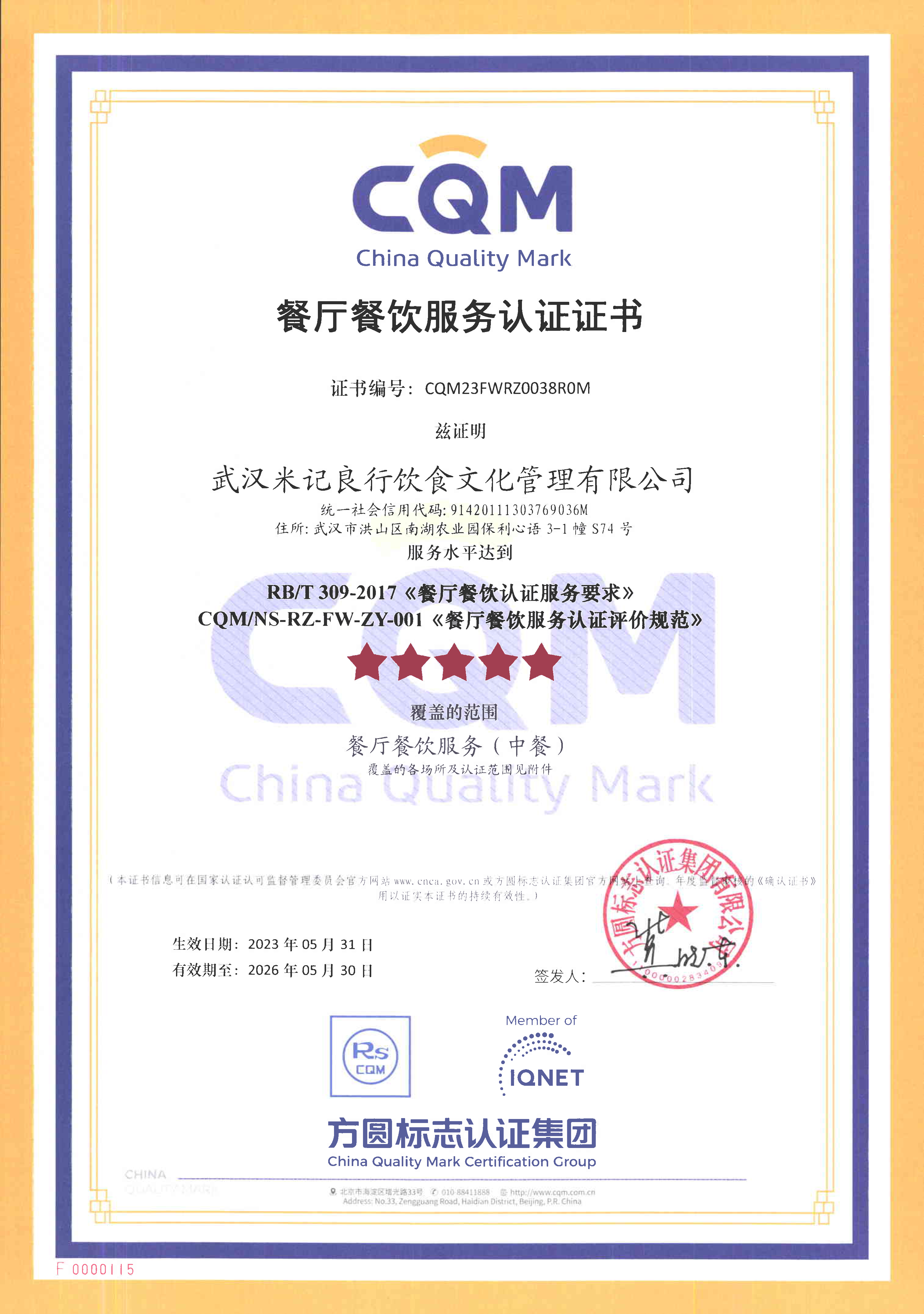 CQM方圓頒發(fā)公司首張餐廳餐飲服務(wù)認(rèn)證證書