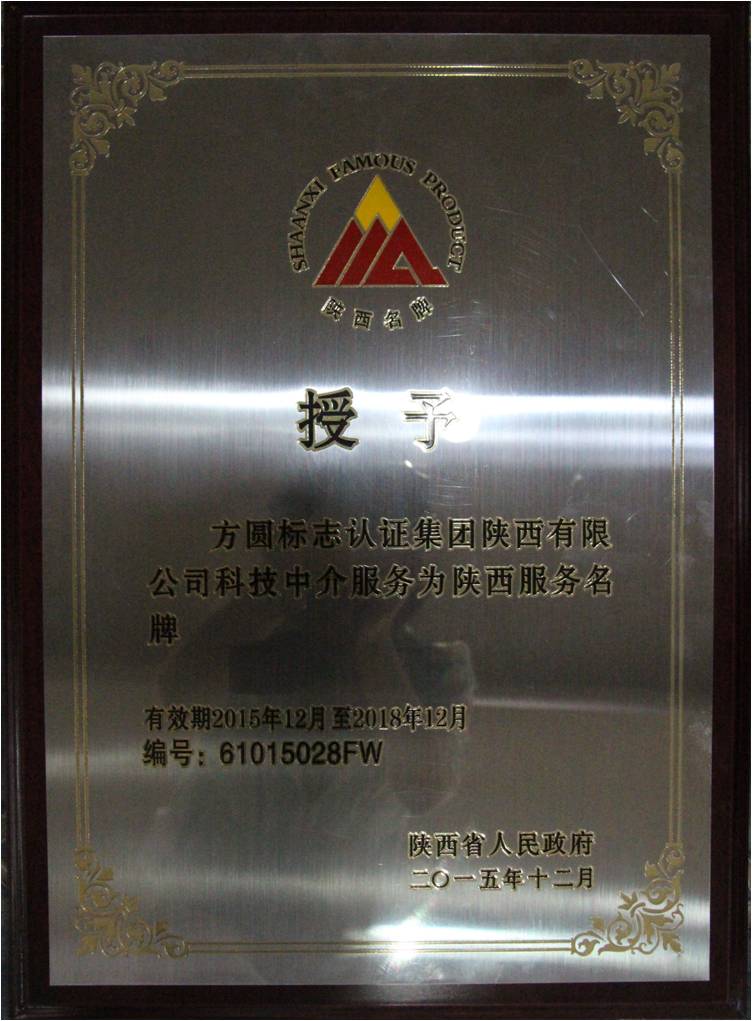 方圓陜西公司喜獲陜西省科技中介服務類服務名牌稱號