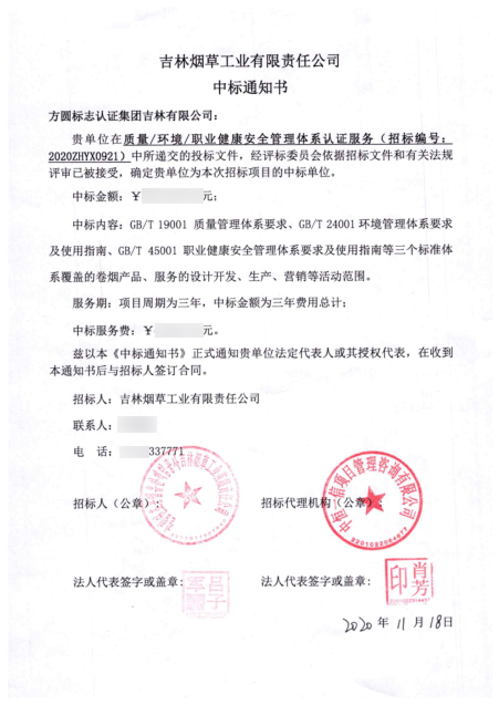 時(shí)間:2020年11月23日 應(yīng)中煙實(shí)業(yè)要求,規(guī)避國企采購風(fēng)險(xiǎn),提高認(rèn)證服務(wù)質(zhì)量和水平,吉林煙草工業(yè)有限責(zé)任公司三體系2020年再認(rèn)證、2021年一次監(jiān)督和2022年二次監(jiān)督整體打包于2020年10月進(jìn)行了面向全國認(rèn)證機(jī)構(gòu)的公開招標(biāo)。