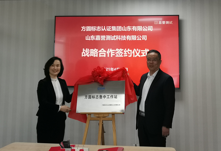 揭牌儀式前,方圓標志認證集團山東有限公司和山東嘉譽測試科技有限公司簽署了戰略合作協議,方圓山東公司副總經理馬書哲、嘉譽測試科技集團副總經理王強代表雙方簽署協議,雙方總經理及部分工作人員見證了簽字儀式。